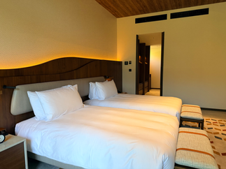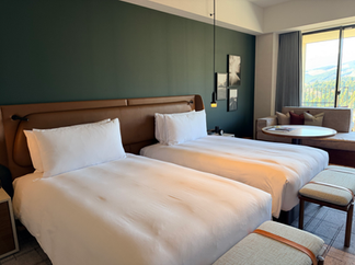 We stayed in a Deluxe King room with a view of Mount Fuji, and waking up to that view was unforgettable. We were lucky to see Mount Fuji on both mornings during our stay. The room was spacious (around 55–60 sqm), elegantly finished, and filled with thoughtful touches: a plush king bed, deep soaker tub, rain shower, balcony, and huge panoramic windows framing the mountain. Of course, there were many subtle motorsports details throughout the room. It was one of those rooms you don't want to leave and look forward to returning to in the evening. It felt like a peaceful sanctuary after thrilling days at the track, a place where calm meets excitement.